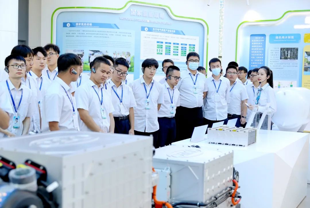 在氢产业科技示范园,解说人员带领新员工详细了解了以燃料电池为产业发展起点,绿色氢能“制、储、运、加、用”全产业链的示范应用。通过观看氢能专题宣传片和在可再生能源发电区、氢气制储区域、氢能应用区域多板块实地参观,促进新员工更深入了解氢能的科技应用。让他们深切体会到园区“氢洁能源、氢净世界”的创新魅力和共创“氢新”时代、共享“氢新”未来的创业活力,对公司氢能全产业链取得的成就由衷地钦佩和自豪。